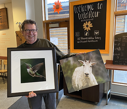 Our collection went on display today at Banff’s Wild Flour Bakery. As we were doing the installation, a bakery customer asked if they could purchase some of our art. So grateful for David from Calgary who became our very first customer by acquiring our Curious Goat Canvas and our Hummy framed print. A huge thank you to Wild Flour Bakery for the wonderful opportunity to display our artwork in Banff.